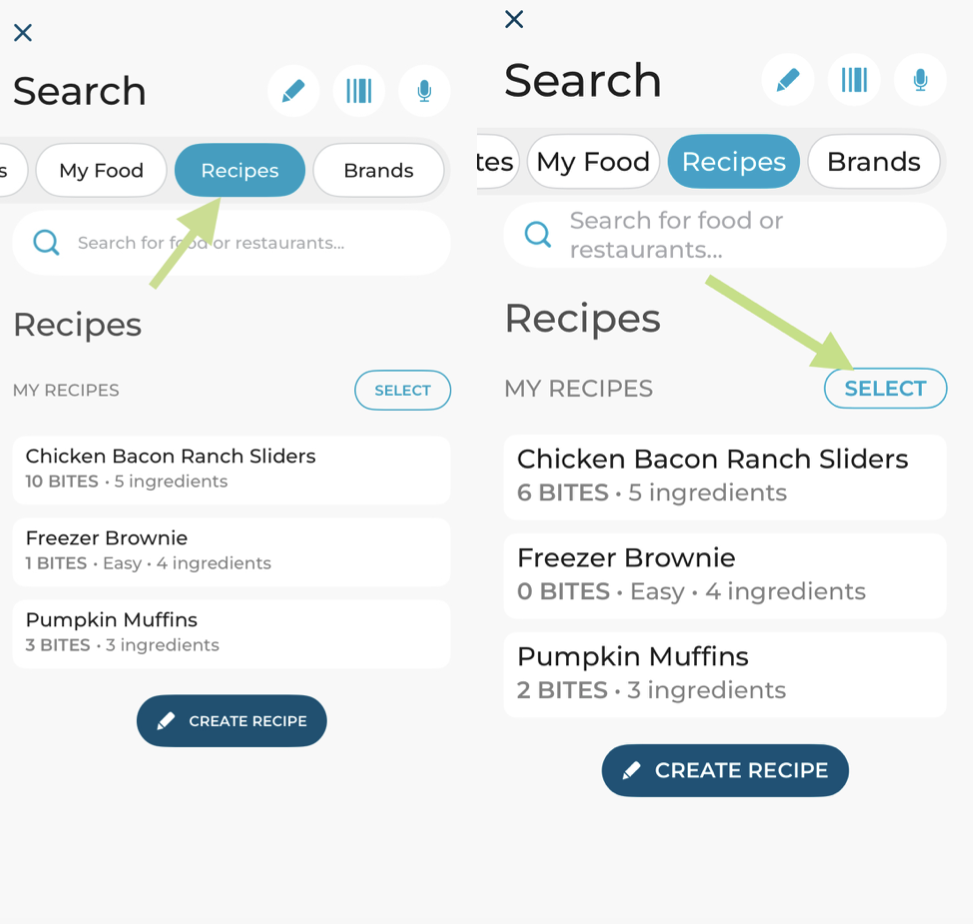- MULTITRACK [➕]: track one or more items by tapping on SELECT and selecting two or more recipes, then tap the ➕Track button at the bottom left.